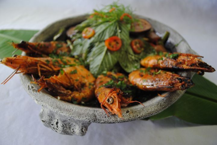 • Langostinos de mar asados al horno, acompañados de vegetales salteados. Preparación fresca y de sabor natural.